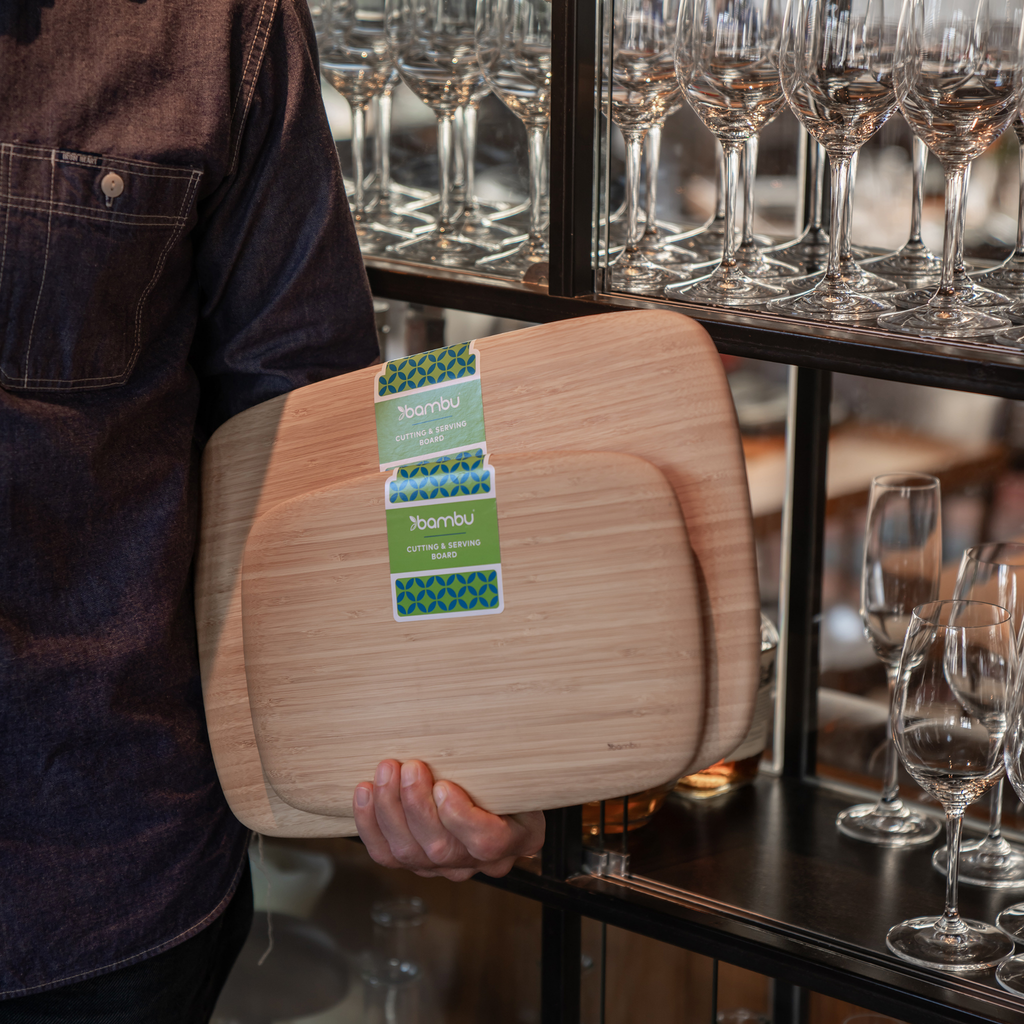 Replace your plastic cutting board or worn out board with this stylish and eco-friendly bamboo cutting board. Available in multiple sizes, our beautiful, handcrafted collection of classic cutting boards are designed to be out on your counter, ready at any time for chopping, dicing, and serving. They have gently rounded edges which give a modern aesthetic. These are fully reversible, so you can cut on one side and pass canapés from the other.