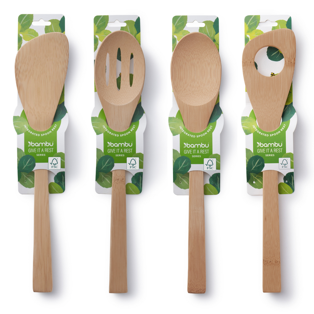 Enter the ‘Give It a Rest’ utensil set, which comes with a spatula, spoon, slotted spoon, and risotto spatula, all hand-crafted from single pieces of bamboo. The best part? Each utensil has a unique, patented bump on the back of it, right beneath the head of the spoon. This built-in spoon rest keeps broths, gravies, sauces, and other liquids from sullying clean counters or stovetops. Never again do you need to hunt around for that spoon rest during the hectic chaos of feeding a family, or tear apart the dishwasher looking for it before a party begins. Now, utensil and rest are a package deal.