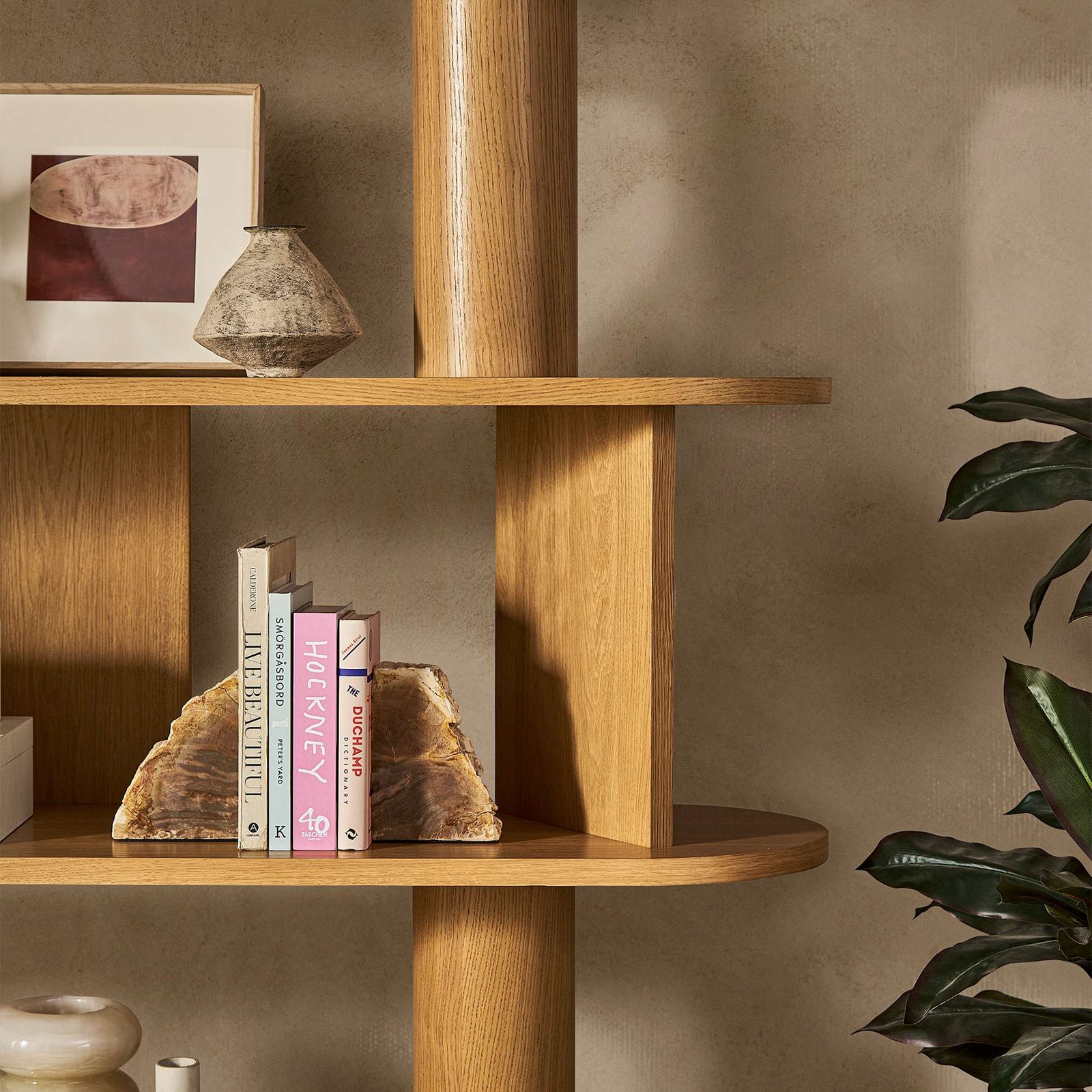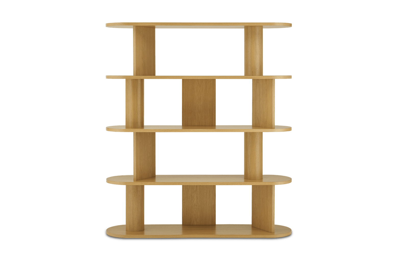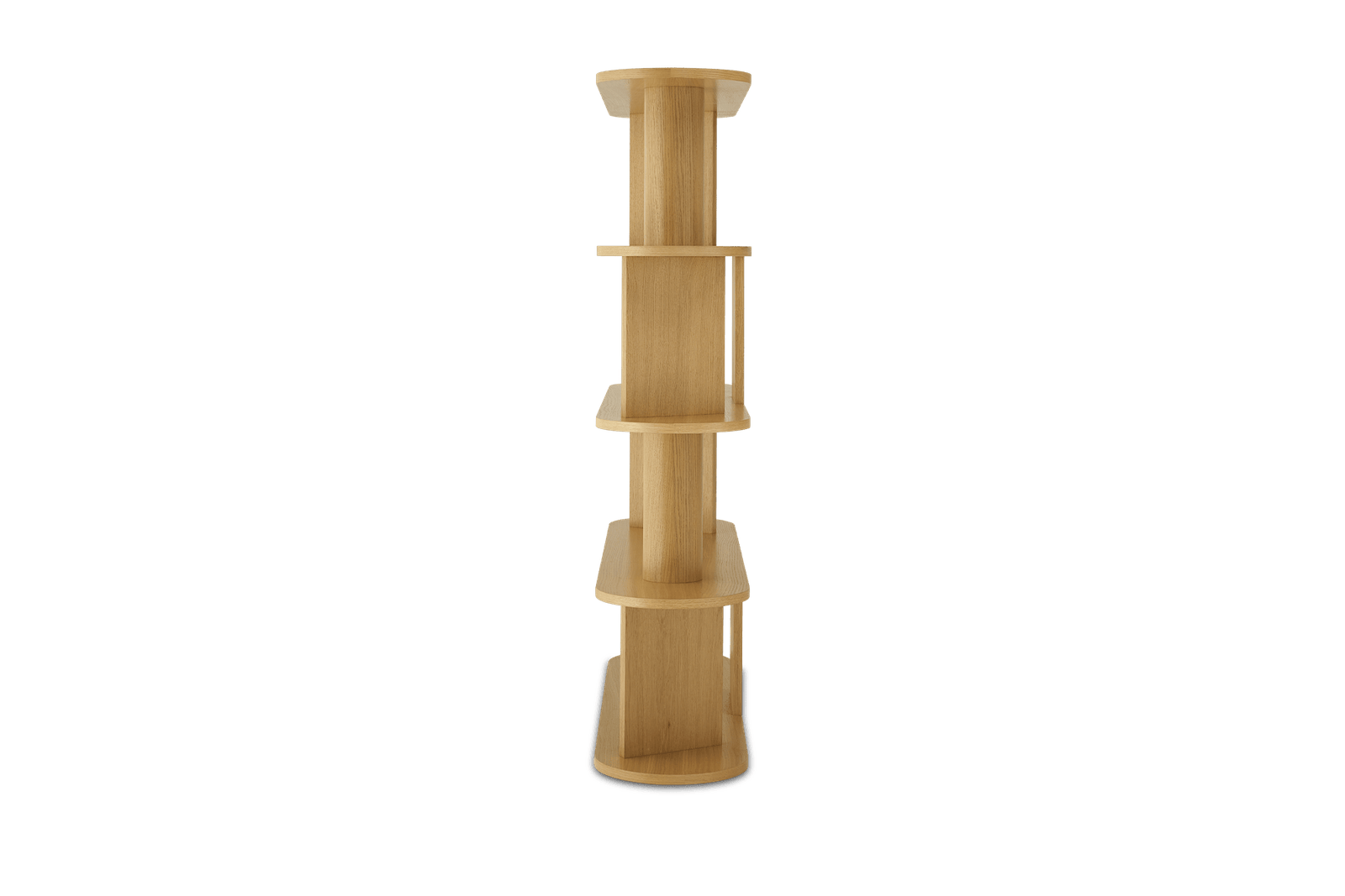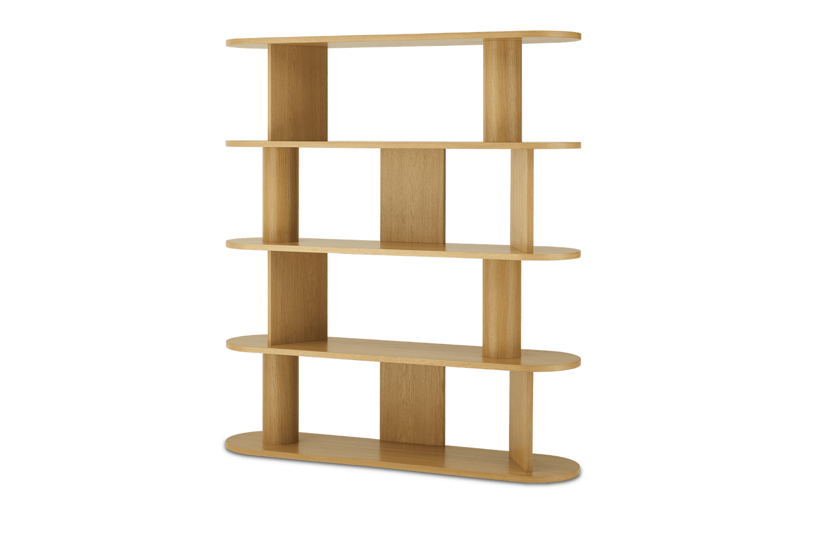 Shelves: engineered wood with oak veneer; Round Pole: solid pine with oak veneer