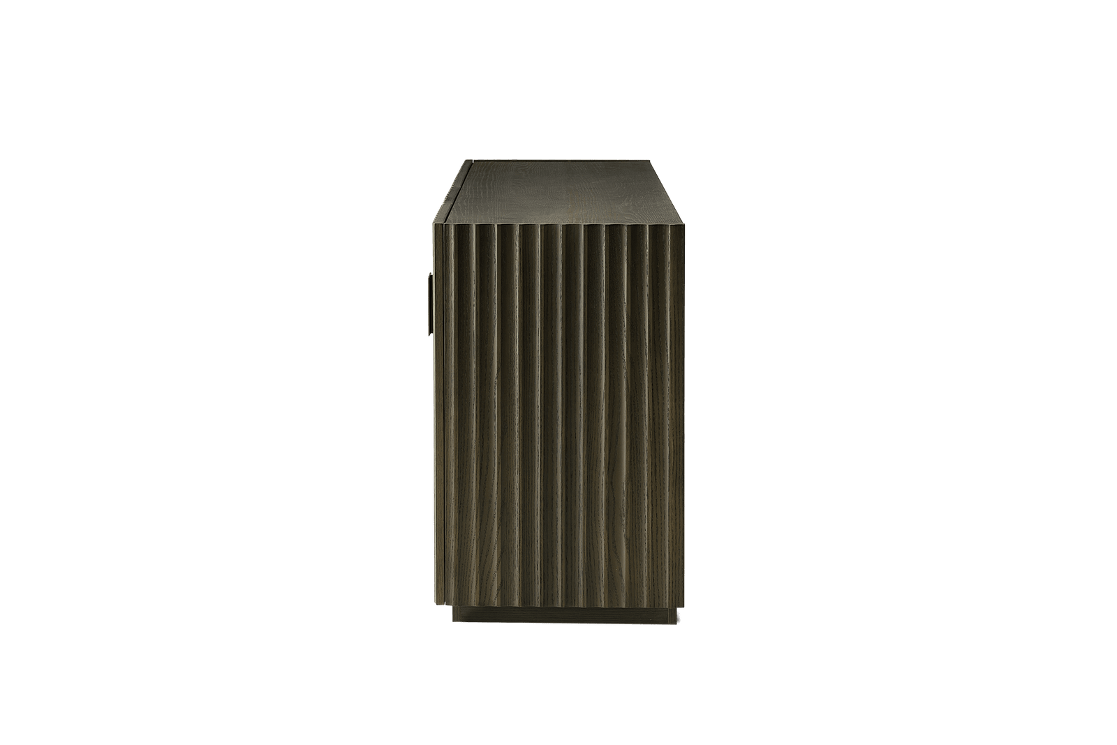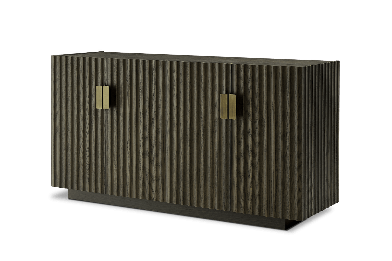 Wood: PU lacquer in grey oak; Metal: brushed brass
