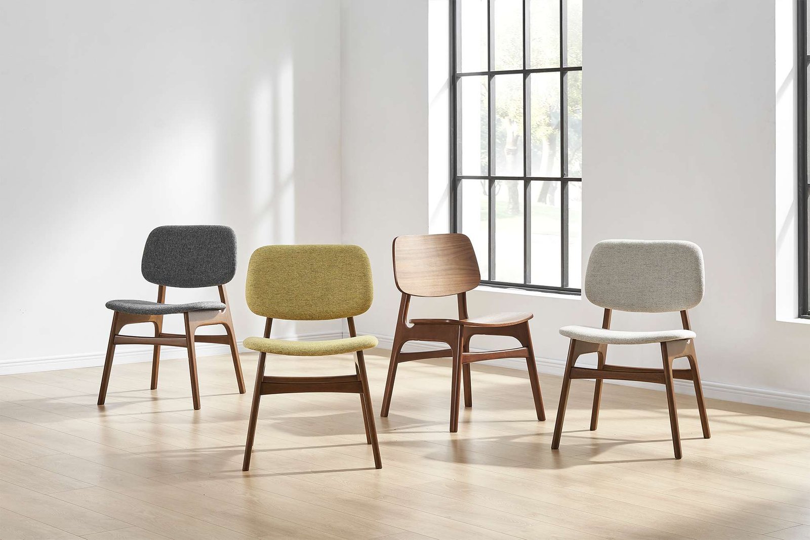 Chair: frame: rubber wood, seat and back: bent wood with PU foam and fabric upholster; Table: solid American walnut wood
